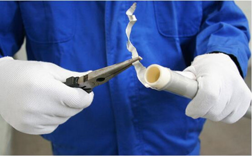 步驟四:去掉鋁合金層:采用鉗子等輔助工具將管材端頭切開(kāi)的鋁合金層去掉。