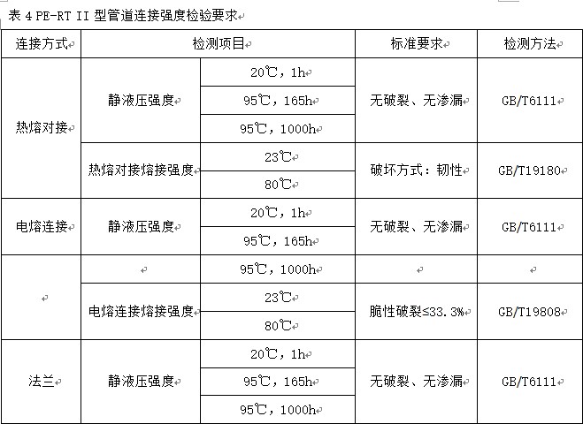 PE-RT II型管材、管件參照GB/T28799-2012執(zhí)行,管道連接強度要求詳見表4
