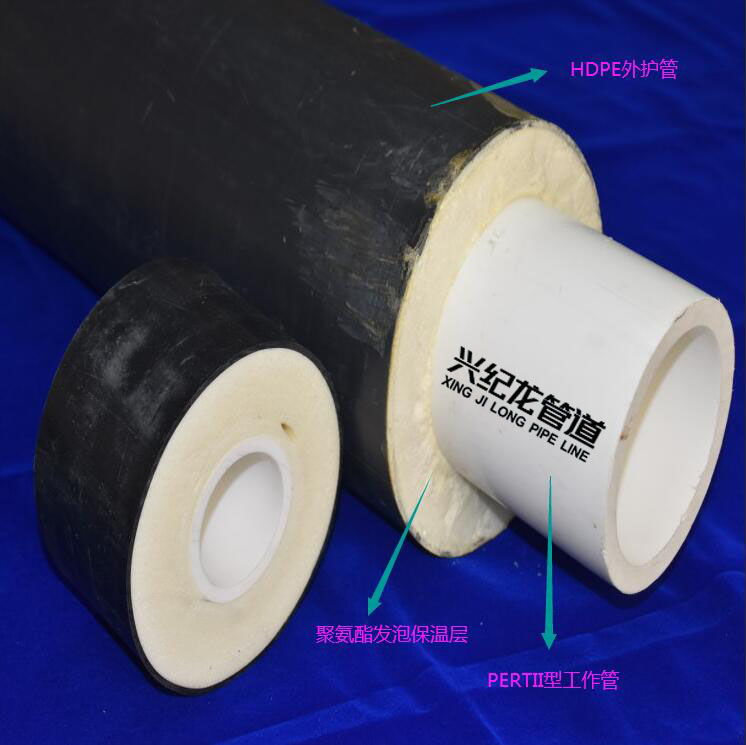 預(yù)制直埋PERTⅡ型保溫管也稱為PE-RTⅡ型供熱管,是一種PE-RTⅡ型工作管(采用耐熱聚乙烯(PE-RT II)管材)、保溫層(采用硬質(zhì)聚氨酯泡沫塑料)、外護管(采用高密度聚乙烯)為一體的工廠預(yù)制產(chǎn)品。